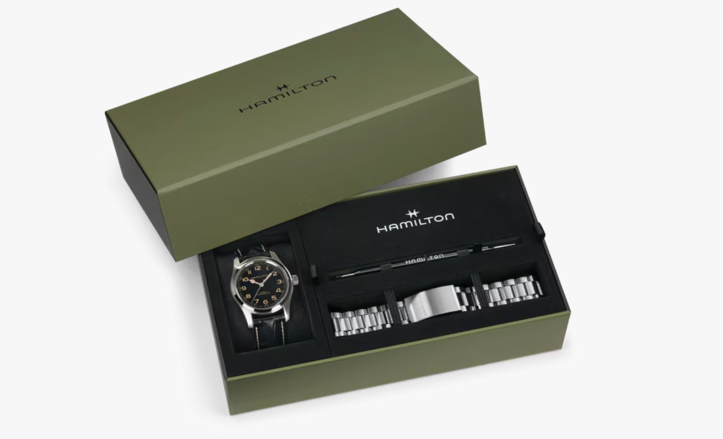 This special bundle set gives you more choices to wear the iconic Khaki Field Murph 42mm, complete with a sophisticated leather strap and a sleek stainless steel bracelet in one special package. Relying on the utmost craftsmanship and know-how, Hamilton is committed to achieving excellence with a focus on durability and attention to detail. Our durable leather straps will add a timeless and enduring appeal to your timepiece, while metal bracelets, engineered for comfort and versatility, give your timepiece a refined and elegant edge.
