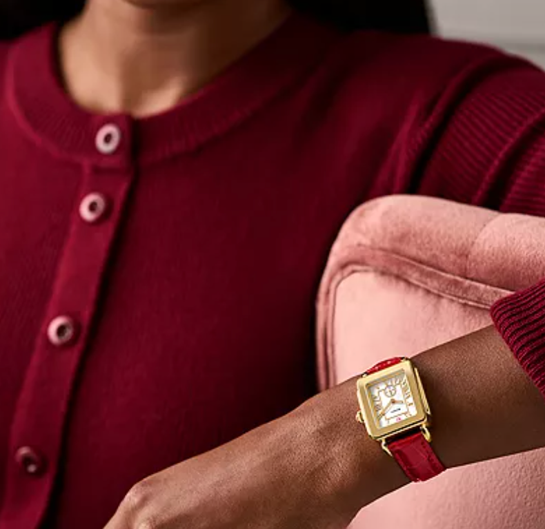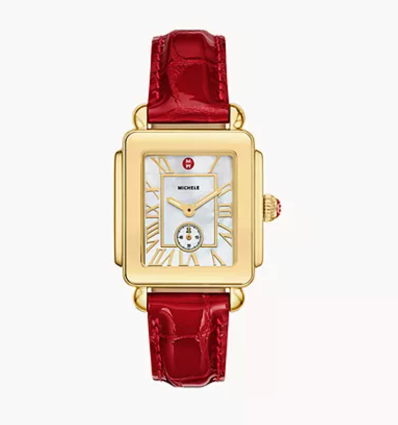The Deco Mid Sport combines a vibrant ruby red color with refined design. Its 31mm rectangular gold-tone stainless steel case frames a mother-of-pearl white dial, accented with polished roman numeral indexes and a sub-second movement. The shiny, croco-embossed leather strap, is interchangeable with any 16mm strap from MICHELE's collection, adding versatility to the design.