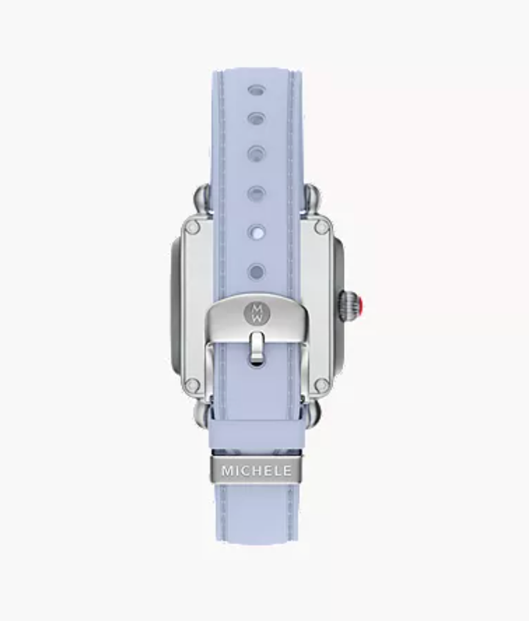 The Deco Sport Mid combines a vibrant pastel blue color with refined design. Its 31mm rectangular stainless steel case frames a white sunray dial, accented with polished roman numeral indexes and a sub-second movement. The pastel blue silicone strap, is interchangeable with any 16mm strap from MICHELE's collection, adding versatility to the design.