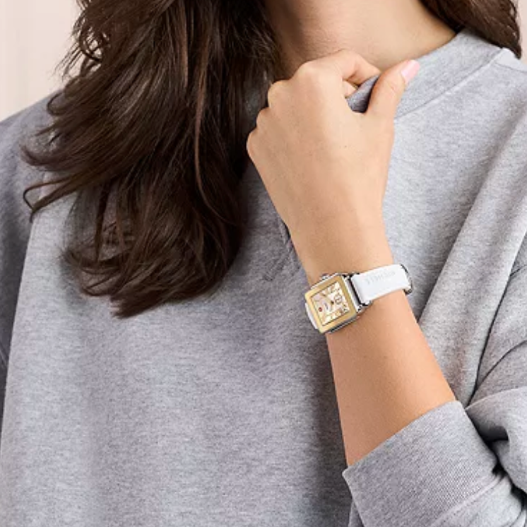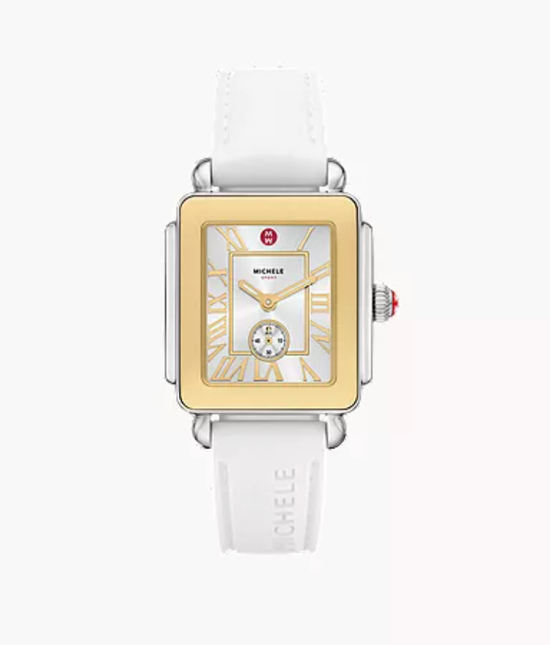 The Deco Sport Mid combines a vibrant bright white color with refined design. Its 31mm rectangular stainless steel case frames a white sunray dial, accented with polished roman numeral indexes and a sub-second movement. The bright white silicone strap, is interchangeable with any 16mm strap from MICHELE's collection, adding versatility to the design.