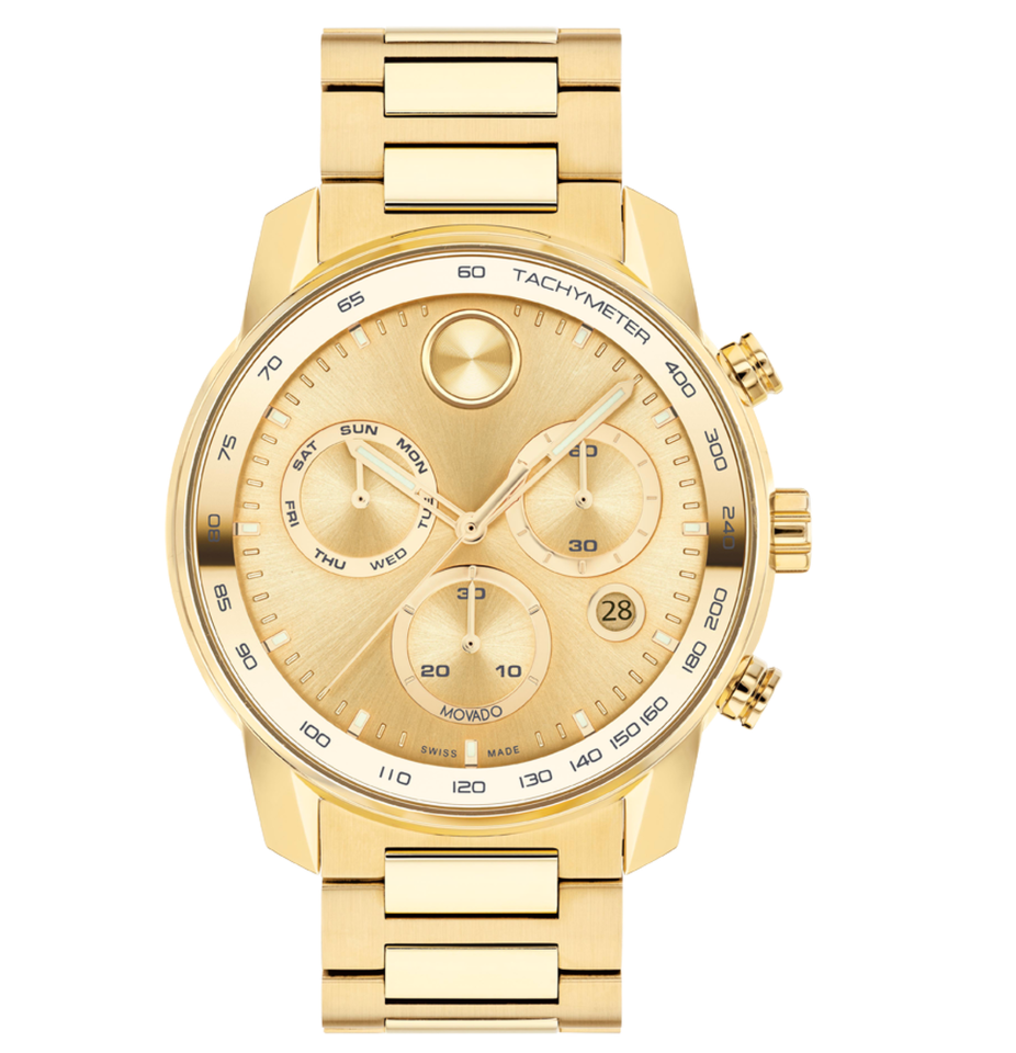 The sporty, eternally stylish chronograph gets a fresh feel with strong, contemporary design that combines modern minimalism and a bold edge. The classic bracelet and statement-making 44mm case are cast in gleaming yellow gold ion-plated stainless steel for a flawlessly refined finish.