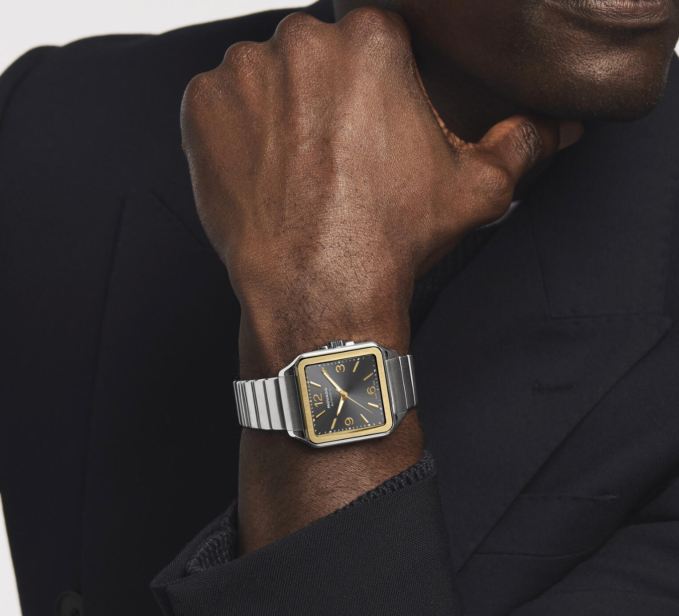 This 35mm x 45.20mm stainless steel watch features a newly reimagined unilink bracelet, a charcoal gray sunburst ombré dial, a gold plated bezel, and an exhibition caseback.