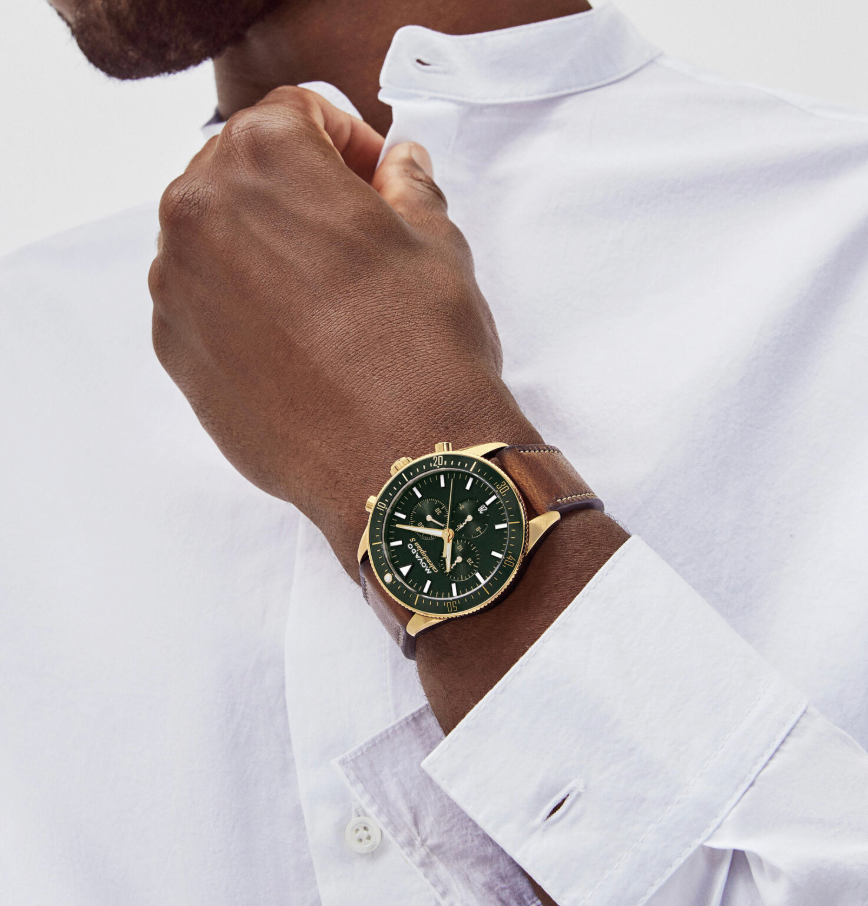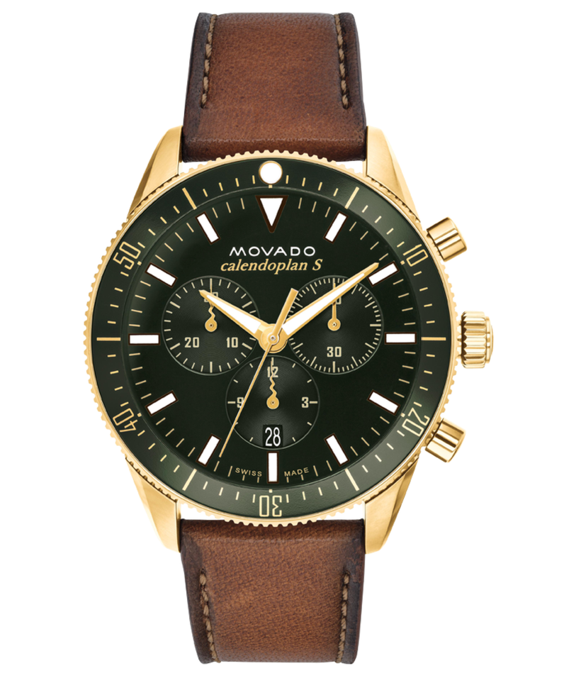 Heritage Calendoplan S Chronograph, 42mm yellow gold-ion plated case with fluidly extended lugs, green aluminum bezel & green chronograph dial. Features Swiss Super-LumiNova® accents on cognac leather strap.