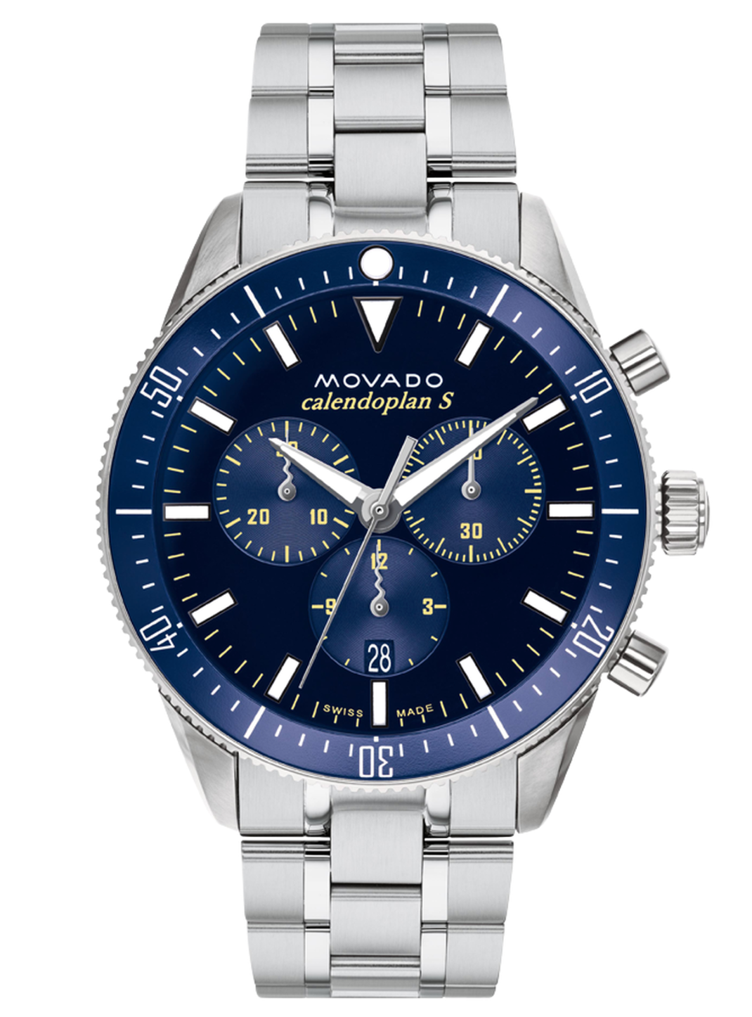 Heritage Calendoplan S Chronograph, 42 mm stainless steel case and bracelet with blue-toned dial & unidirectional rotating bezel.