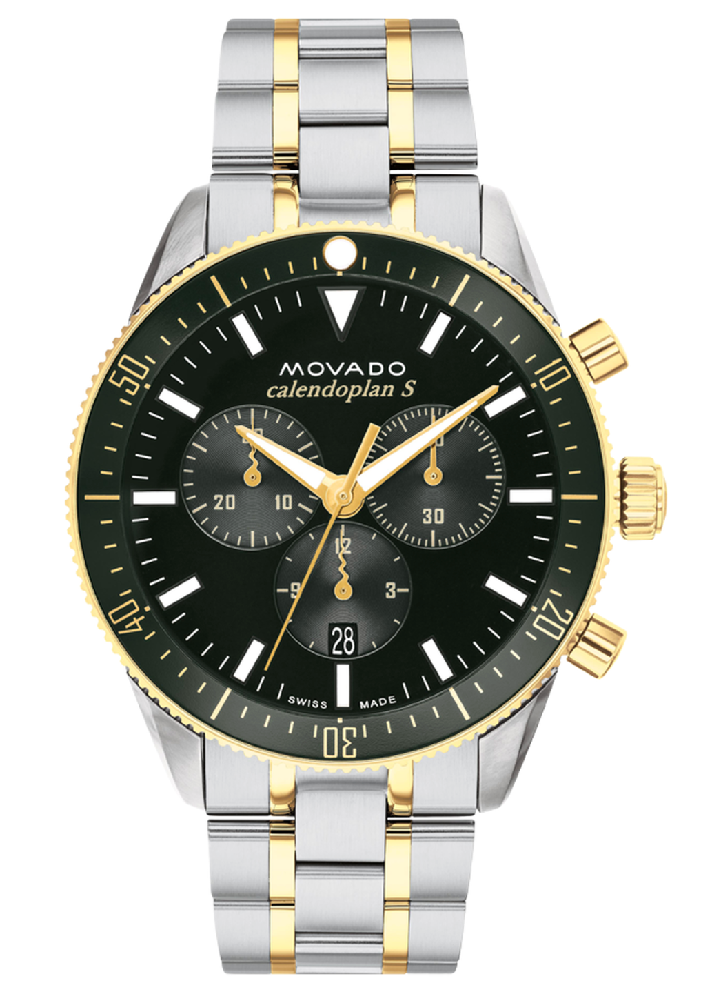 Iconic mid-century design gets a fresh feel. First introduced in 1950, this contemporary-cool design is inspired by our archives with a modern sporty feel. This timepiece features a two-tone 42mm case in classic stainless steel accented by yellow gold ion-plating with a green unidirectional rotating bezel. The green chronograph dial is outfitted with three subdials, Swiss Super-LumiNova® accents and a date window. We’ve completed the design with a fluid bracelet in versatile stainless steel with gleaming yellow gold ion-plated accents.