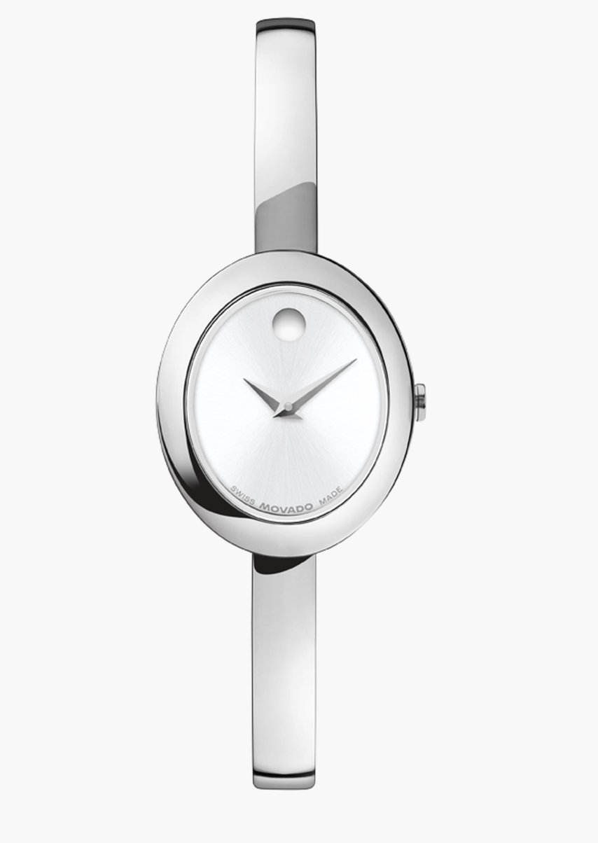 Modern, minimal, and made to stack. The Jewelry-Inspired Movado Museum Bangle.This 21.5mm by 25.5mm watch features an oval silver white sunray dial, steel dauphine hands, and our signature dot at 12 o'clock.