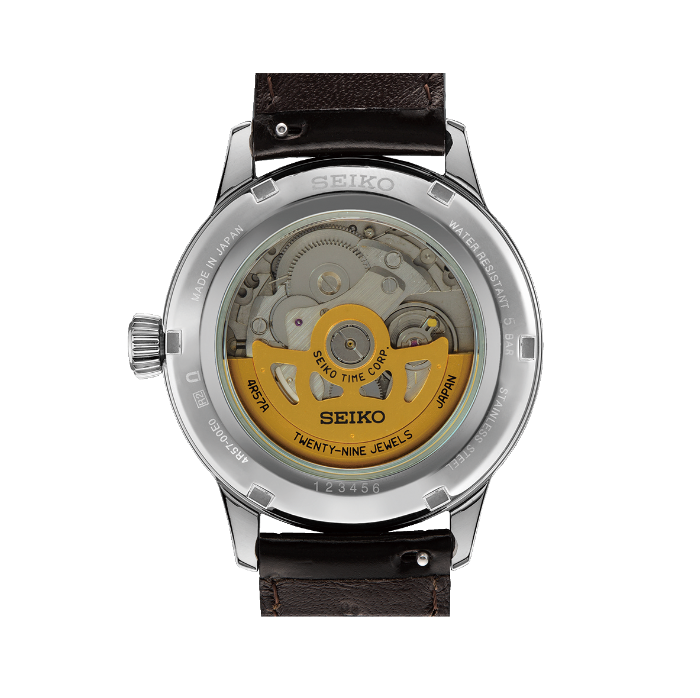 This elegant timepiece is driven by the 4R57 automatic movement with manual winding capability, offering a power reserve of approximately 41 hours and set with 29 jewels for smooth precision. Its functions include a date hand, a power reserve indicator, and a stop second hand feature for accurate time setting. The stainless steel case measures 40.5mm in diameter, 14.4mm in thickness, and 47.5mm from lug to lug, with a 20mm lug width that ensures a comfortable fit. A box-shaped Hardlex crystal protects the dial, while a supple cow leather strap adds a refined touch, secured by a three-fold clasp with push-button release.