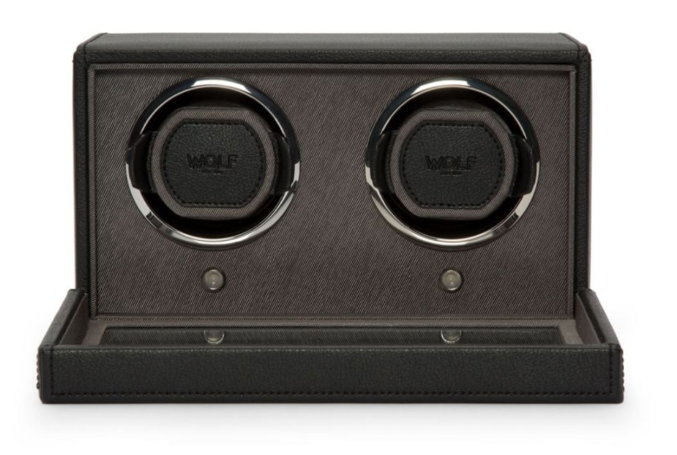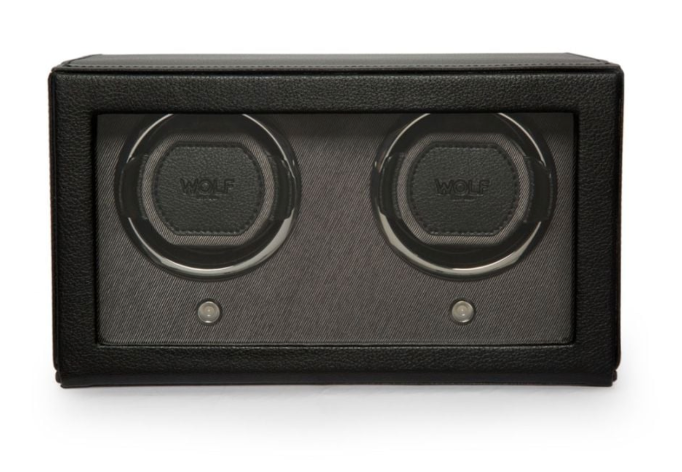 Young, smart and uncomplicated, the cub takes care of your watch with ease. Six sides perfectly proportioned to encase your timepiece safely and precisely. Never miss a beat in your busy life. Features black vegan leather, chrome finished hardware and two winding modules.